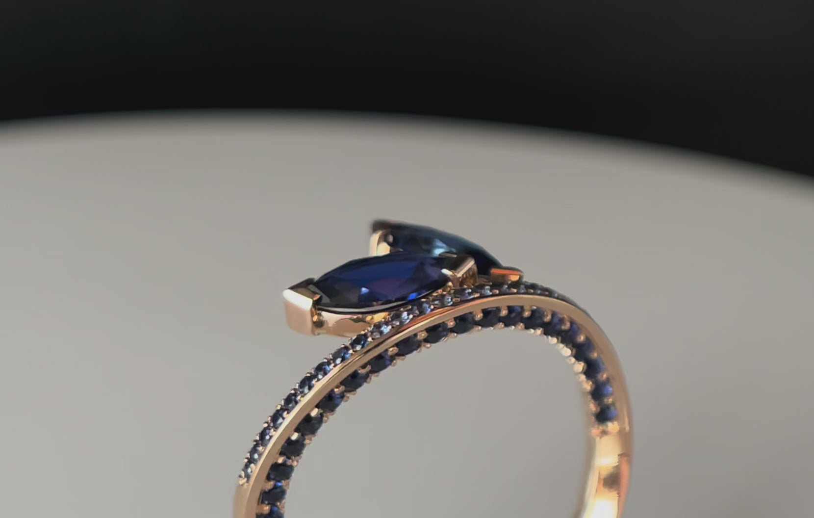 Anillo talla 7.5 talla americana en oro amarillo 18k. Piedra en Filee 2 zafiros azules marquiz de 5x7. 40 zafiros color en degrade LG de 1mm. 8 LG clear eye de 1mm.